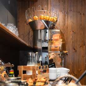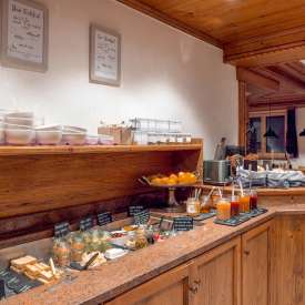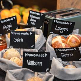 Pourquoi notre buffet de petit-déjeuner haut de gamme est-il si réputé ? Nous vous servons de nombreux produits faits maison, notamment des petits pains provenant de notre propre boulangerie, la confiture « Mum's » et du birchermüesli préparé avec amour. Nous vous proposons également des délices fraîchement préparés, tels que des fruits de saison, des plats à base d'œufs ou du jus d'orange et de carotte. Les yaourts et les fromages proviennent de nos voisins, les saucisses et la viande de la boucherie du village, et la menthe poivrée et la mélisse citronnée pour le thé de notre propre jardin. Il vous manque quelque chose ? N'hésitez pas à nous le faire savoir.