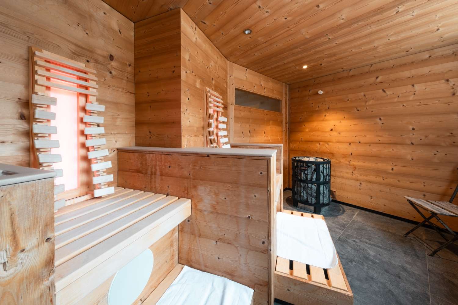 Détente absolue au spa du Bella Vista. Avec notre offre « Spa privé », vous pouvez vous ressourcer pendant deux heures et profiter en toute exclusivité des installations de notre espace bien-être. Entre deux séances de sauna, une pause détente dans la salle Arvenstube et un bain glacé rafraîchissant, vous pouvez trinquer à votre santé, à Zermatt et à la vie avec un verre de prosecco.